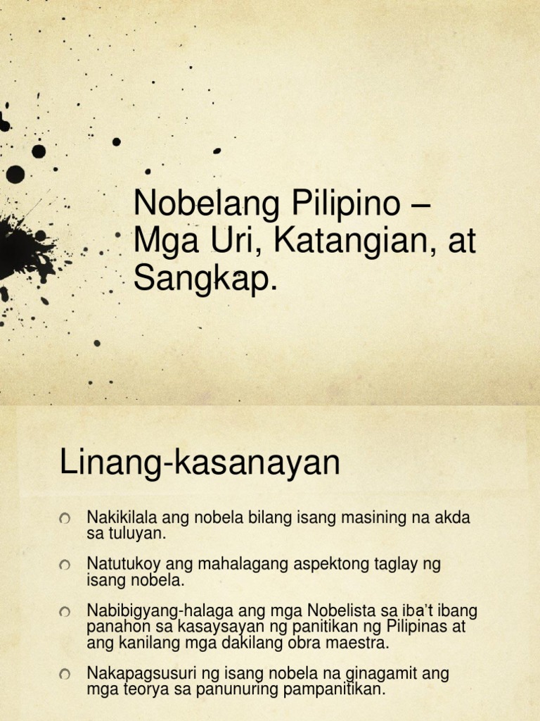 Ano ang mga katangian ng isang nobela. Halimbawa sinasabing ang isang tao ay may kalidad ng pagkamalikhain kapag nakalikha siya ng isang bagay na orihinal at nobela. Bayograpikal Nasasalamin dito ang buhay ng awtor. Historikal Ilalagay kung anong taon o importanteng pangyayari sa.