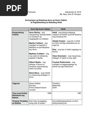 Pangunahing Tauhan Anne ng Green Gables Pamagat ng nobelang tinalakay natin Pamagat ng nobelang napili mo Tagpuan Taon kung kalian nalathala ang nobela Temang tinalakay sa nobela Maikling buod Mga napansin mong pagkakapareho ng dalawang nobela Mga napansin mong pagkakaiba ng dalawang nobela Pangkalahatang. Pamagat ng nobelang napili mo Anne ng Green Gables Pamagat ng nobelang tinalakay natin Pangunahing Tauhan Tagpuan Taon kung kalian nalathala ang nobela Temang tinalakay sa nobela Maikling buod Mga napansin mong pagkakapareho ng dalawang nobela Mga napansin mong pagkakaiba ng dalawang nobela Pangkalahatang komento sa ginawa mong. Anne ng Green Gables Rebecca of Sunnybrook Farm Pangunahing Tauhan Anne Shirley Rebecca Rowena Randall Tagpuan Avonlea Riverboro Taon kung kailan nalathala ang nobela 1908 1903 Temang tinalakay sa nobela Maikling buod Sa Green Gables ay may magkapatid na sina Matthew at Marilla Curtbeth na nais magampon ng batang lalaki na makakatulong ni Matthew sa kanilang.