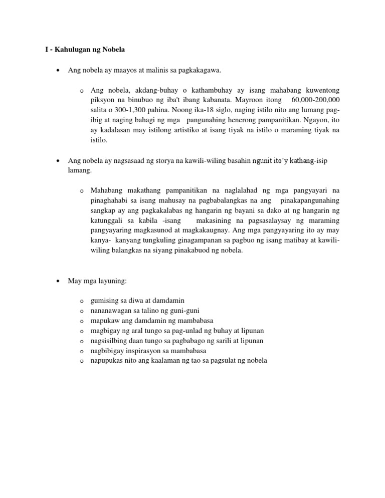Istilo ng Nobela 1 Kinatha o fiksyonalisadong realidad may. Up to 24 cash back Ang nobela ay isang mahabang kathang pampanitikan na naglalahad ng mga pangyayari na pinaghahabi sa isang mahusay na pagbabalangkas na ang pinakapangunahing sangkap ay ang pagkakalabas ng hangarin ng bayani sa dako at ng hangarin ng katunggali sa kabila -isang makasining na pagsasalaysay ng maraming pangyayaring. -Magiging tiyak at malinaw ang pagsulat kung.