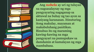 Magbigay ng isang uri ng nobela. Ito ay ginagawa sa isang malikhaing pagsasalaysay ng pangyayari. PANITIKAPANITIKA NN NobelaNobela 2.