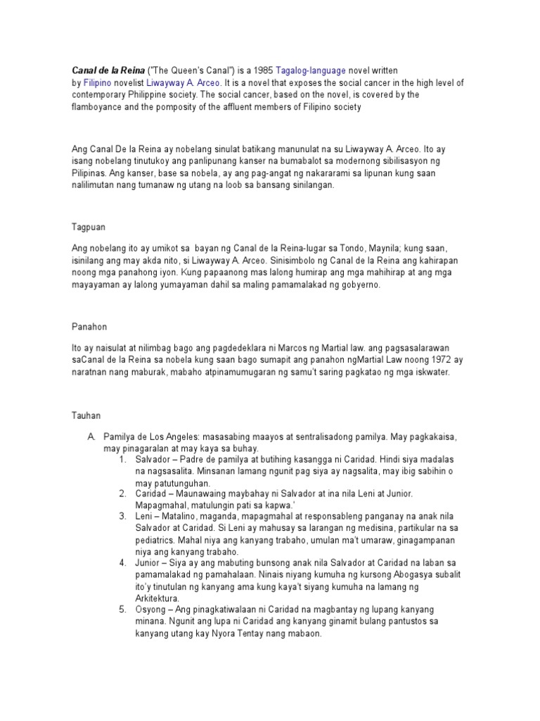 Arceo Kauna-unahang nobela ng awtor. Canal de la Reina ni Liwayway A. Arceo ay pangunahing mangangathang Tagalog at Filipino na nakasulat ng 90 nobela 2 libong mahigit na kuwento 1 libong mahigit na sanaysay 36 tomo ng iskrip sa radyo 7 aklat ng salin 3 iskrip sa telebisyon at di-mabilang na kuntil-butil na lathalain sa halos lahat ng pangunahing publikasyong Tagalog o Filipino.
